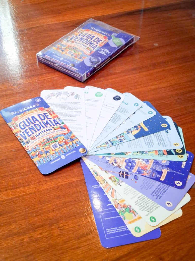 Esta guía es un objeto de diseño pensado para acompañar la experiencia vendimial. Por su formato —tiene el tamaño aproximado de un celular— puede llevarse en una cartera o mochila y consultarse en el momento, o bien conservarse en casa como una recopilación de experiencias. Está pensada para compartir, regalar y llevar al mundo una parte de la identidad mendocina.