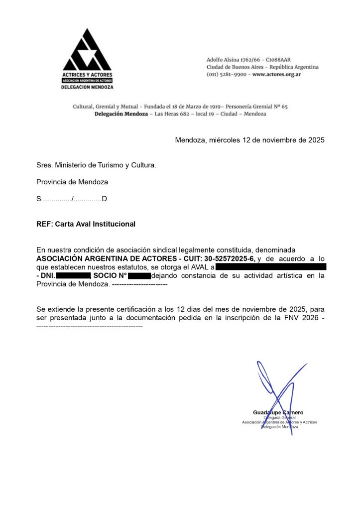 - AVAL emitido por AAAyA (formato PDF), se descarga del botón derecho de https://www.actoresyactricesmza.com.ar/certificados#Saval-vendimia