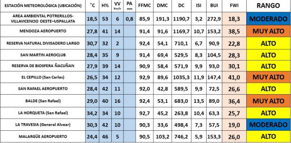 El valor de BUI (combustible disponible), para la Estación Meteorológica de ÁREA AMBIENTAL POTRERILLOS, USPALLATA, VILLAVICENCIO, MENDOZA AERO, SAN MARTÍN AERO, EL CEPILLO Y MALARGÜE AEROPUERTO se encuentran muy elevados, lo que representa que la totalidad del combustible vegetal muerto, seco y en contacto con el suelo, de diámetro medio y grueso como así también las dos últimas capas compactadas de vegetación subterránea, están completamente predispuestas para la ignición y el fuego contínuo.