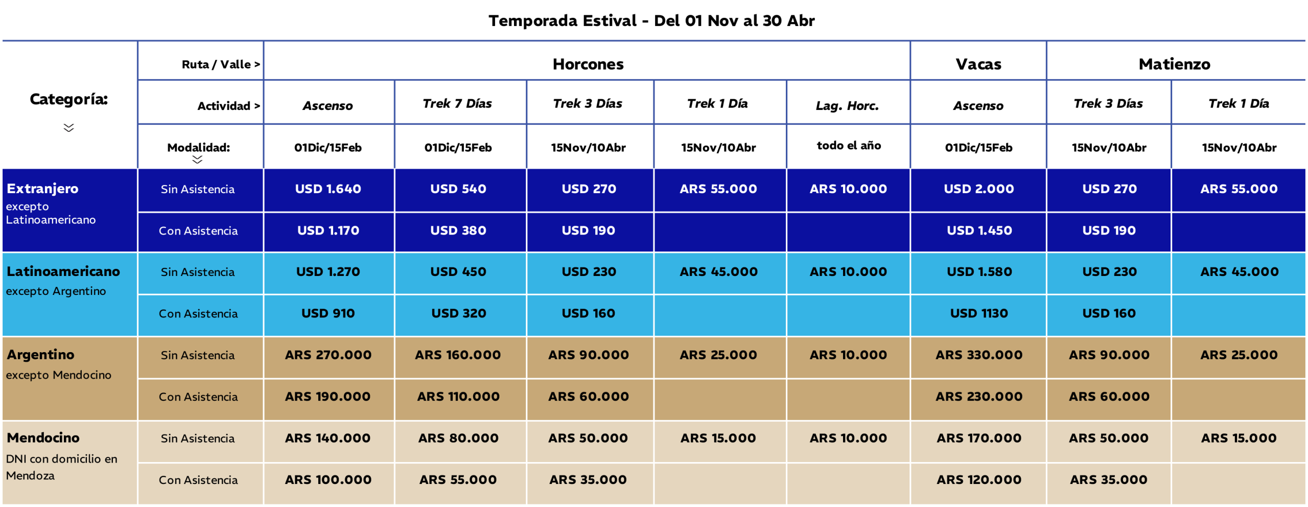 | Permiso | de Ascenso hasta la cumbre | Ascenso por Horcones a Plaza de Mulas o por Vacas a Plaza Argentina, continúa hasta la cumbre por campamentos de altura. Opción con o sin Asistencia de Empresa Habilitada. Dificultad Alta, debe contratar Seguro de Evacuación. |