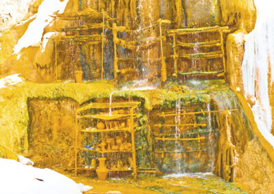 Sus aguas termales (a unos 34°C aproximadamente) contienen cloruro de sodio, vestigios de hierro y otros minerales que dan origen a pequeñas concreciones cubriendo la zona con una carcasa ferruginosa que le otorga vistoso colorido de tonalidades naranjas, amarillas y ocres. Los colores amarillentos denotan la presencia de azufre.
