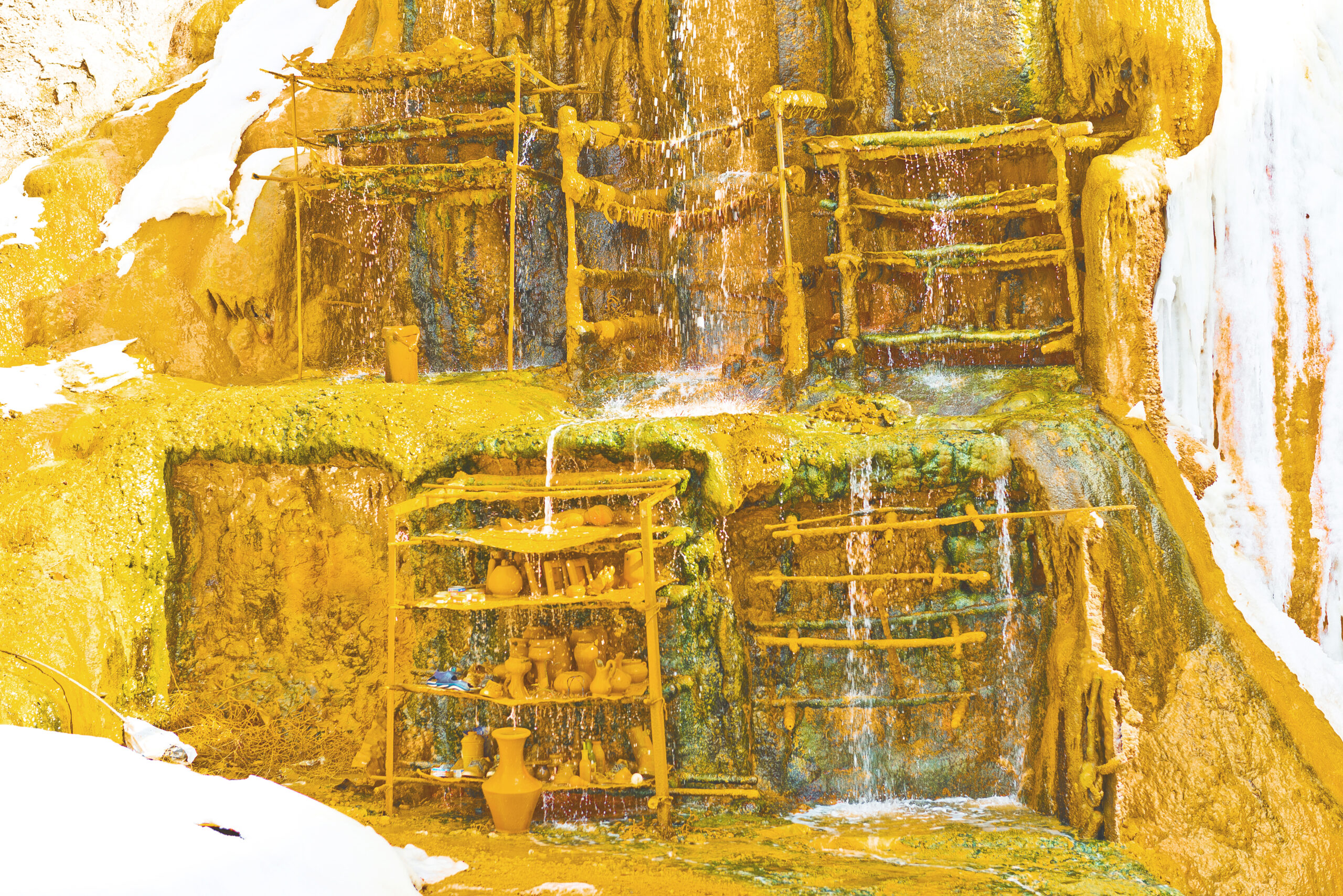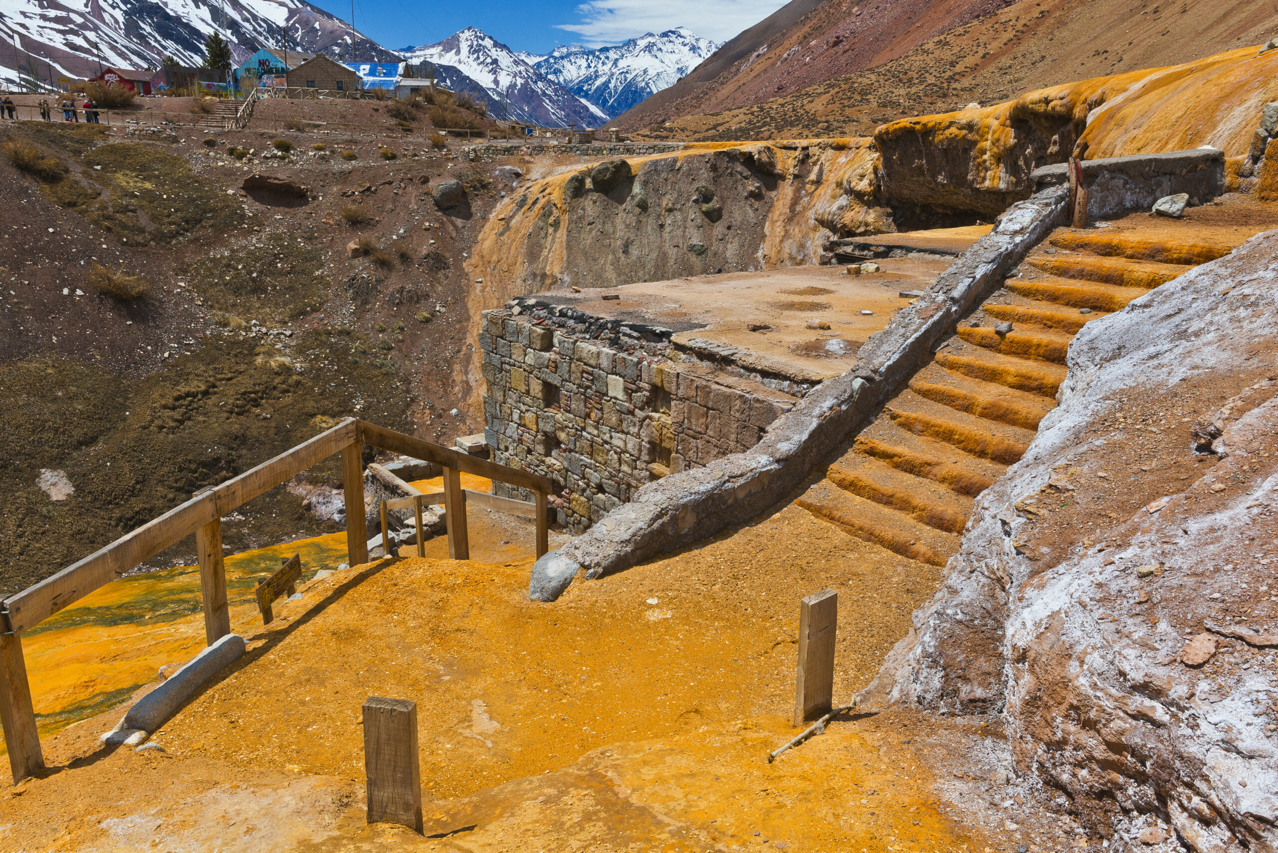 Sus aguas termales (a unos 34°C aproximadamente) contienen cloruro de sodio, vestigios de hierro y otros minerales que dan origen a pequeñas concreciones cubriendo la zona con una carcasa ferruginosa que le otorga vistoso colorido de tonalidades naranjas, amarillas y ocres. Los colores amarillentos denotan la presencia de azufre.