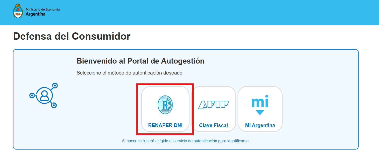 El denunciante deberá ingresar al siguiente portal para iniciar el proceso. Asegúrate de tener a mano tu DNI para continuar con la validación de identidad. Debera Seleccionar la opcion RENAPER DNI tal como se ve en la imagen.