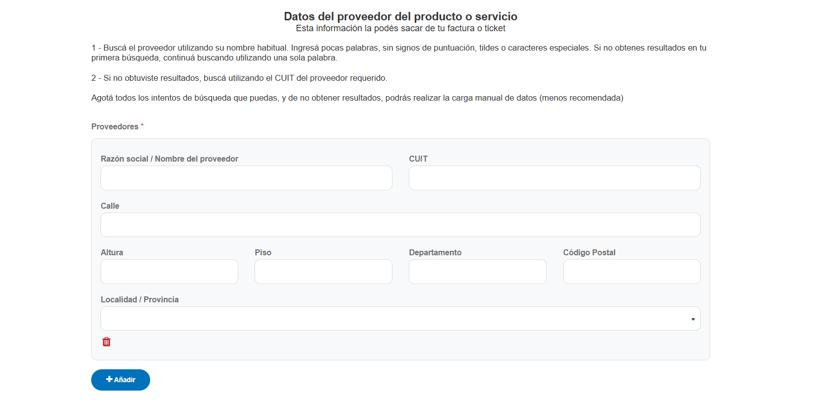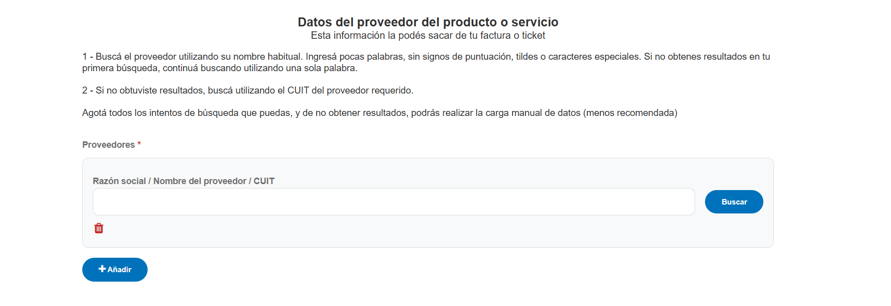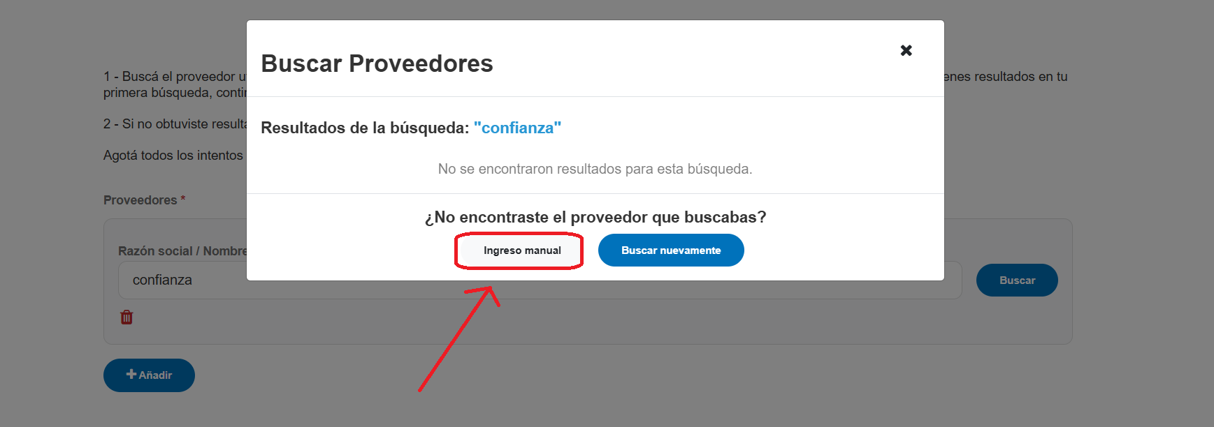 Si en la busqueda del paso anterior, no encuentra el proveedor que quiere denunciar, puede agregarlo en forma manual.