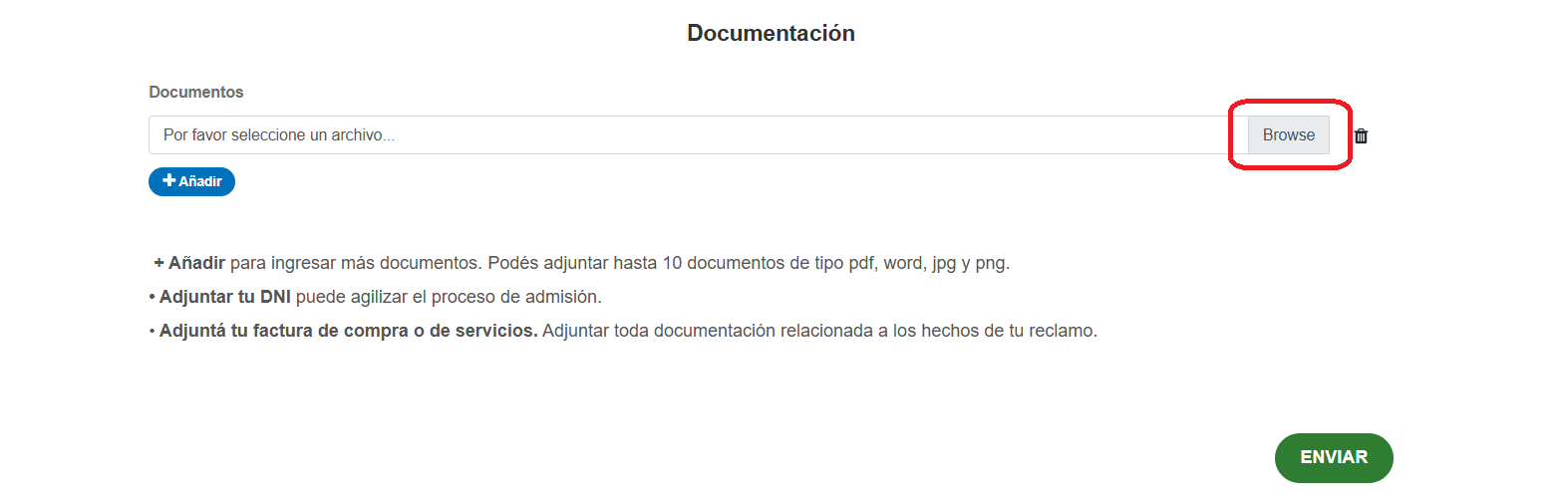 Agregar la documentación probatoria haciendo click en el boton «Browse»