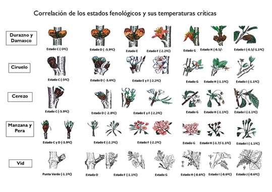 | Especie | Receso Invernal | Yemas cerradas | Plena floración | Pequeños frutos verdes | Fruto 2 cm. |