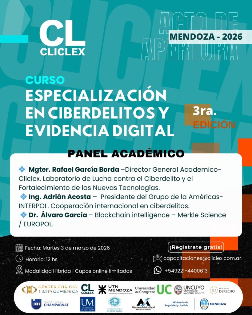 Entre los expositores se destacan el magíster Rafael García Borda, director general académico de Cliclex y coordinador del Equipo de Criptoactivos de la Procuración General ante la Suprema Corte de Justicia de la provincia de Buenos Aires; el ingeniero Adrián Acosta, presidente del Grupo de las Américas de Interpol y director general de Cibercrimen; y el doctor Álvaro García, director de Operaciones Comerciales de Merkle Science, con experiencia en Europol (Cibercrimen) y exintegrante de Chainalysis